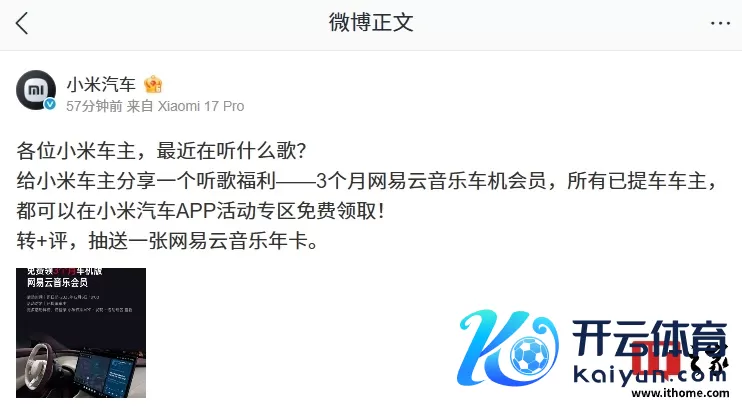 IT之家 11 月 17 日音尘,小米汽车本日晓谕为车主提供一项福利 —— 3 个月网易云音乐车契机员。通盘已提车车主,齐不错在小米汽车 App 动作专区免费领取。