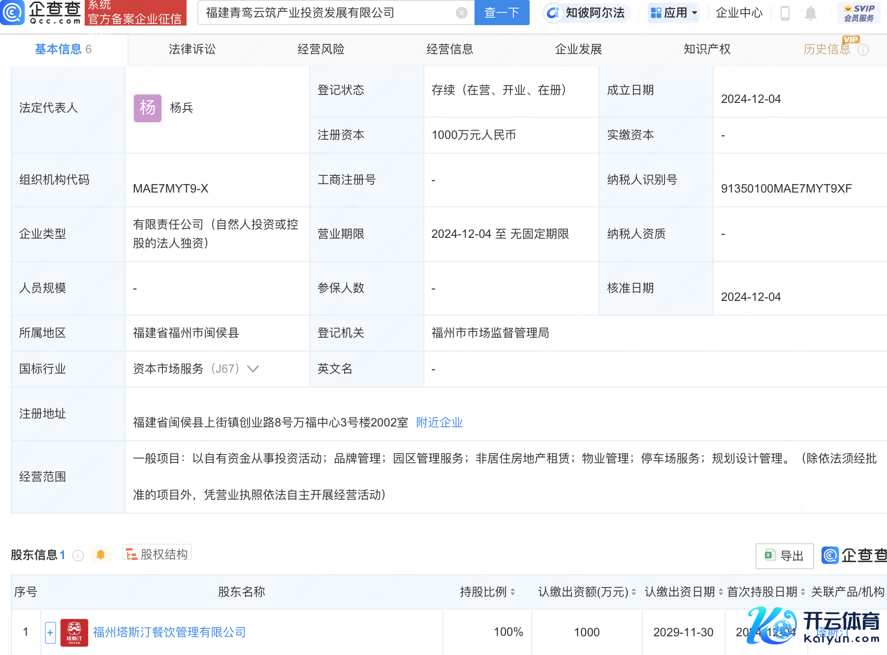 企查查APP显现,近日,福建青鸾云筑产业投资发展有限公司设立,法定代表东谈主为杨兵,注册成本1000万东谈主民币,主义边界含以自有资金从事投资动作、品牌处理、园区处理作事、非居住房地产租借等。企查查股权穿透显现线上赌钱APP大全,该公司由福州塔斯汀餐饮处理有限公司全资捏股。