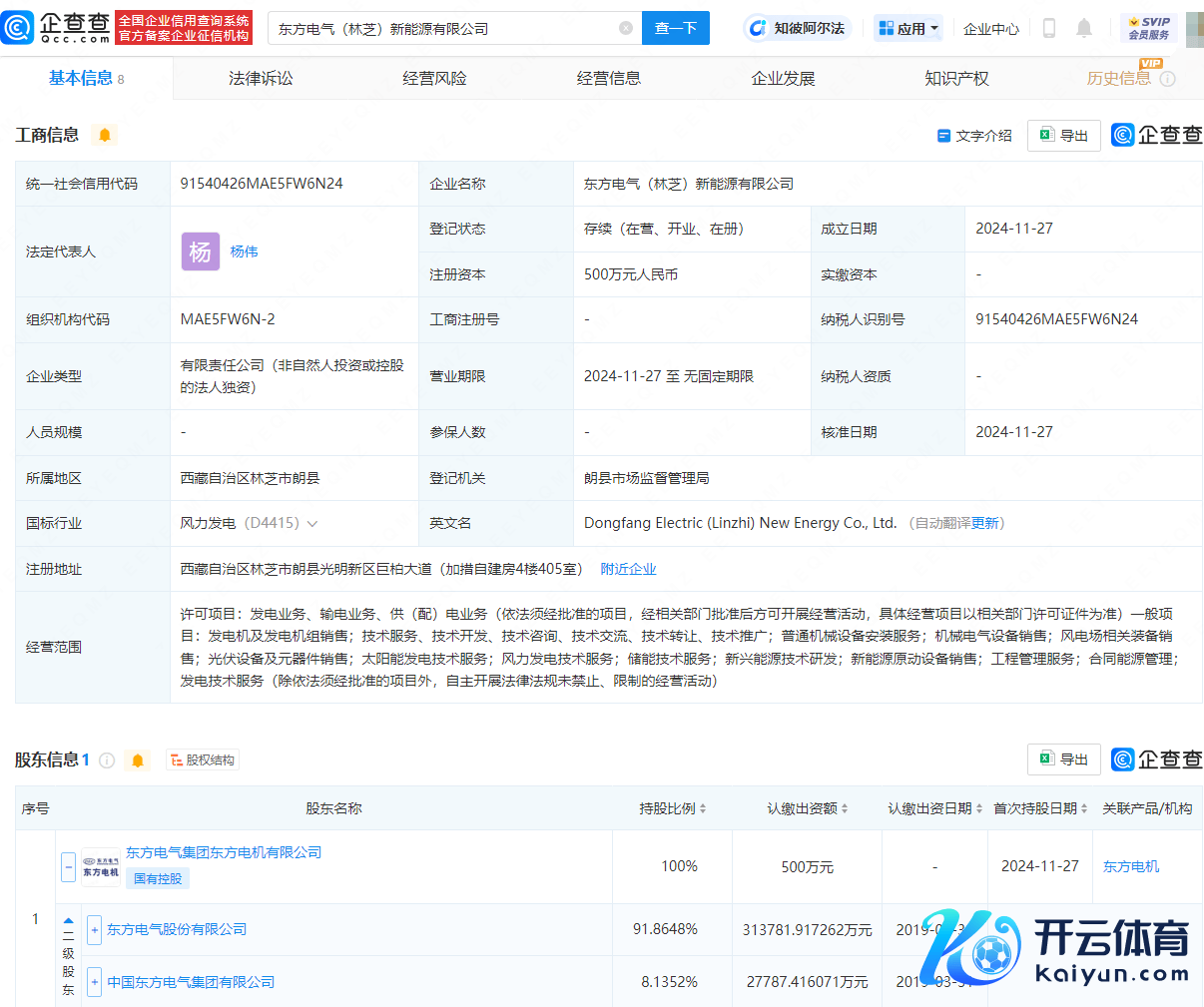 企查查APP显现,近日赌钱app下载,东方电气(林芝)新动力有限公司开垦,法定代表东谈主为杨伟,注册本钱为500万元东谈主民币,说合范围包含:发电业务、输电业务、供(配)电业务;机械电气开垦销售;风电场关联装备销售;光伏开垦及元器件销售;太阳能发电期间事业等。企查查股权穿透显现,该公司由东方电气(600875)旗下东方电气集团东方电机有限公司全资执股。