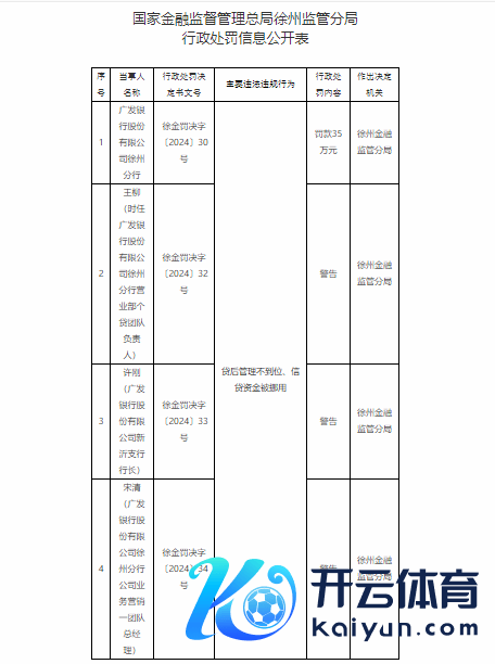 此外,国度金融监督处罚总局徐州监管分局对王柳(时任广发银行徐州分行营业部个贷团队讲求东谈主)、许刚(广发银行新沂支行行长)、宋清(广发银行徐州分行公司业务营销一团队总司理)作出劝诫。