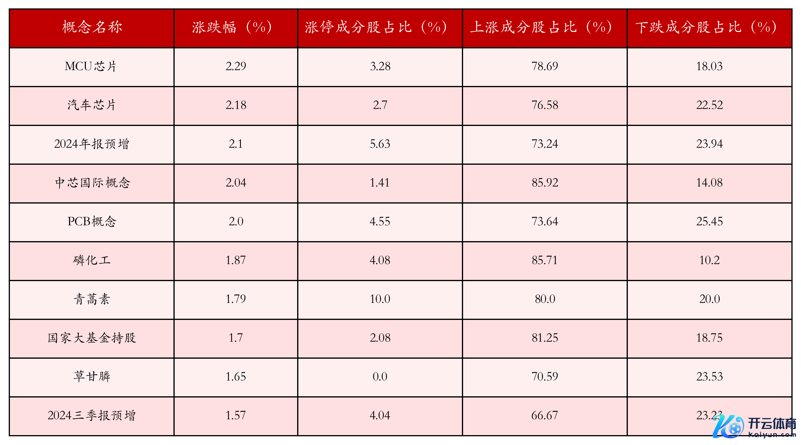 笔据A股意见涨跌幅与所对应的股票池轮廓分析,涨幅靠前的三个意见板块远离为:MCU芯片、汽车芯片与2024年报预增。名次前10位的意见板块有关数据见下表: