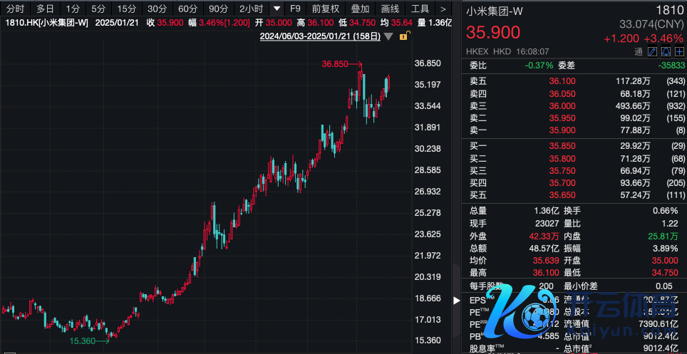 二级商场方面,2024年,小米集团股价涨幅逾越120%,踏入2025年,小米集团仍然保握升势,1月6日盘中最高涉及36.85港元,股价再度刷新历史高点。罢休记者发稿,小米集团本日涨幅逾越3%。