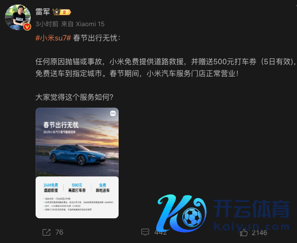 1月21日下昼,雷军发布微博称,小米su7春节出行无忧,任何原因抛锚或事故,小米免费提供谈路救援,并救济500元打车券(5日有用),免费送车到指定城市。春节技能,小米汽车行状门店泛泛贸易。