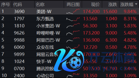 科网龙头强势领涨,好意思团-W收涨9.84%;小米集团-W涨5.83%,股价站上56港元,再改进高;哔哩哔哩-W涨超5%,阿里巴巴-W涨超4%,腾讯控股、快手-W涨逾3%。