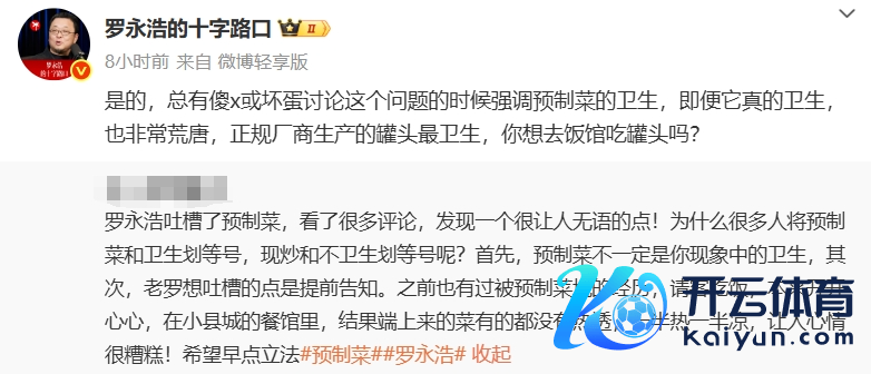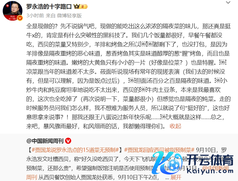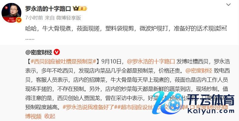 有网友对罗永浩的不雅点示意认可,认为餐厅使用预制菜自身无可厚非,但应明确见知消费者认为;也有网友吐槽西贝,“根底莫得现作念的锅气,主如果还很贵。”有的网友认为,包括西贝在内的许多选址市集的餐饮门店,受到硬件设施济弃,不成能现场制作耗技巧的大菜,也不错领会;还有网友吐槽罗永浩“只敢捡软柿子握”并质疑其动机。