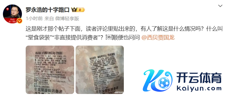 由于罗永浩对于预制菜的了解也有限,他还在一又友圈和微博搜集熟练预制菜行业内幕的东谈主士,并示意将搜集专科机构检测预制菜。值得一提的是,罗永浩当晚还在微博连发多条微博和网友互动,并向质疑西贝的网友搜集字据;之后,罗永浩贴出两张网友发的印有“堂食袋装”的冻品像片喊话贾国龙。