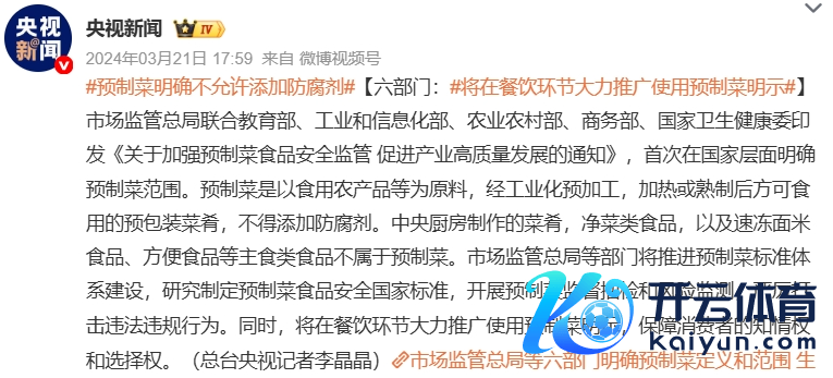 客岁3月,市场监管总局销亡教化部、工业和信息化部、农业农村部、商务部、国度卫生健康委印发《对于加强预制菜食物安全监管 促进产业高质地发展的请问》,从国度层面明确了预制菜的界说和边界,功令预制菜中不添加防腐剂,执行餐饮方法使用预制菜昭示。